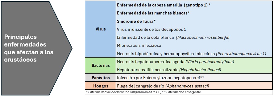 El reglamento de ejecución (UE) 2018/1882 establece un listado y categorización de enfermedades para su control en la Unión Europea. En los crustáceos están incluidas: la infección por el virus del síndrome de  las manchas blancas (WSSV), categorizada como C+D+E, la infección por el virus de la cabeza amarilla (YHV) y la infección por el virus del síndrome de Taura (TSV), categorizadas como A+D+E.