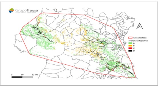 La tabla y el mapa siguientes muestran las zonas afectadas y el grado de afectación.