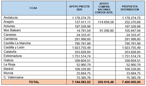 El importe restante, 205.916,48 euros, se destina a Aragón y Baleares, las dos comunidades en las que este año se ha detectado la aparición de un nuevo serotipo de lengua azul y se emplearán en la adquisición de vacunas.