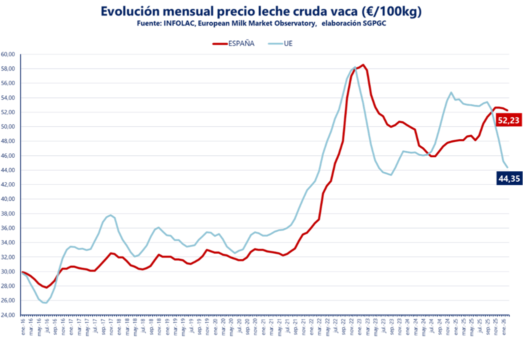Por otro lado, los precios percibidos por los ganaderos han mostrado un comportamiento favorable a lo largo de 2025 y en el inicio de 2026, situándose incluso por encima de la media de la Unión Europea, en el entorno de los 0,53 euros el litro de leche pagado a los ganaderos frente a una media de 0,44 euros/litro de la UE (enero de 2026). El precio en España se sitúa en un 16 % por encima de la media de la UE. Entre los factores que explican esta situación se encuentran el aumento de la producción en otros Estados miembros y la aplicación en España de instrumentos como el paquete lácteo y la ley de la cadena alimentaria.